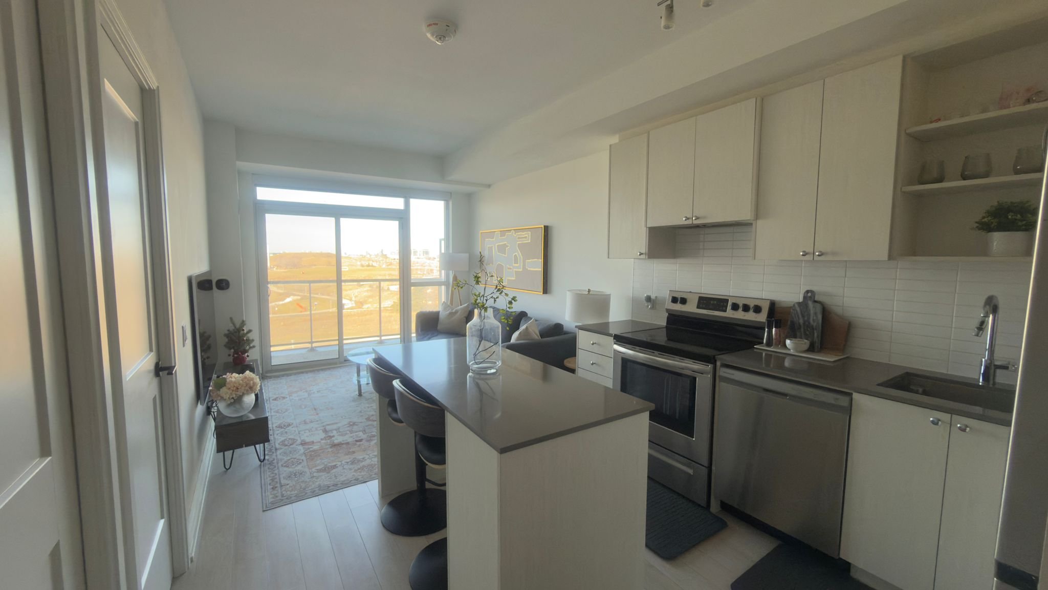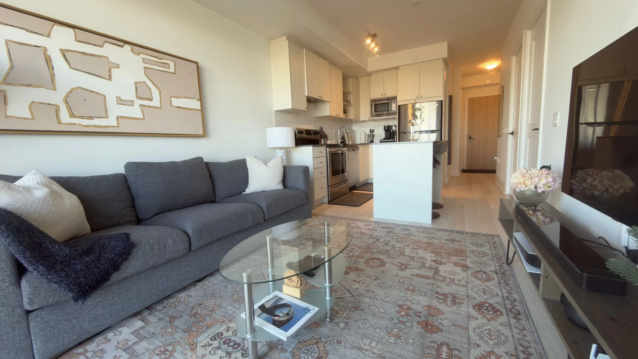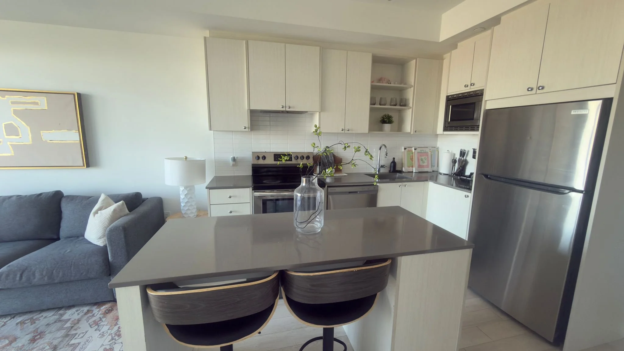 Inside, the layout is smart, functional, and easy to live in. The open-concept kitchen is finished with quartz countertops, stainless steel appliances, and clean, modern lines. The den gives you options. Work from home, create, or carve out that extra bit of space every condo needs.