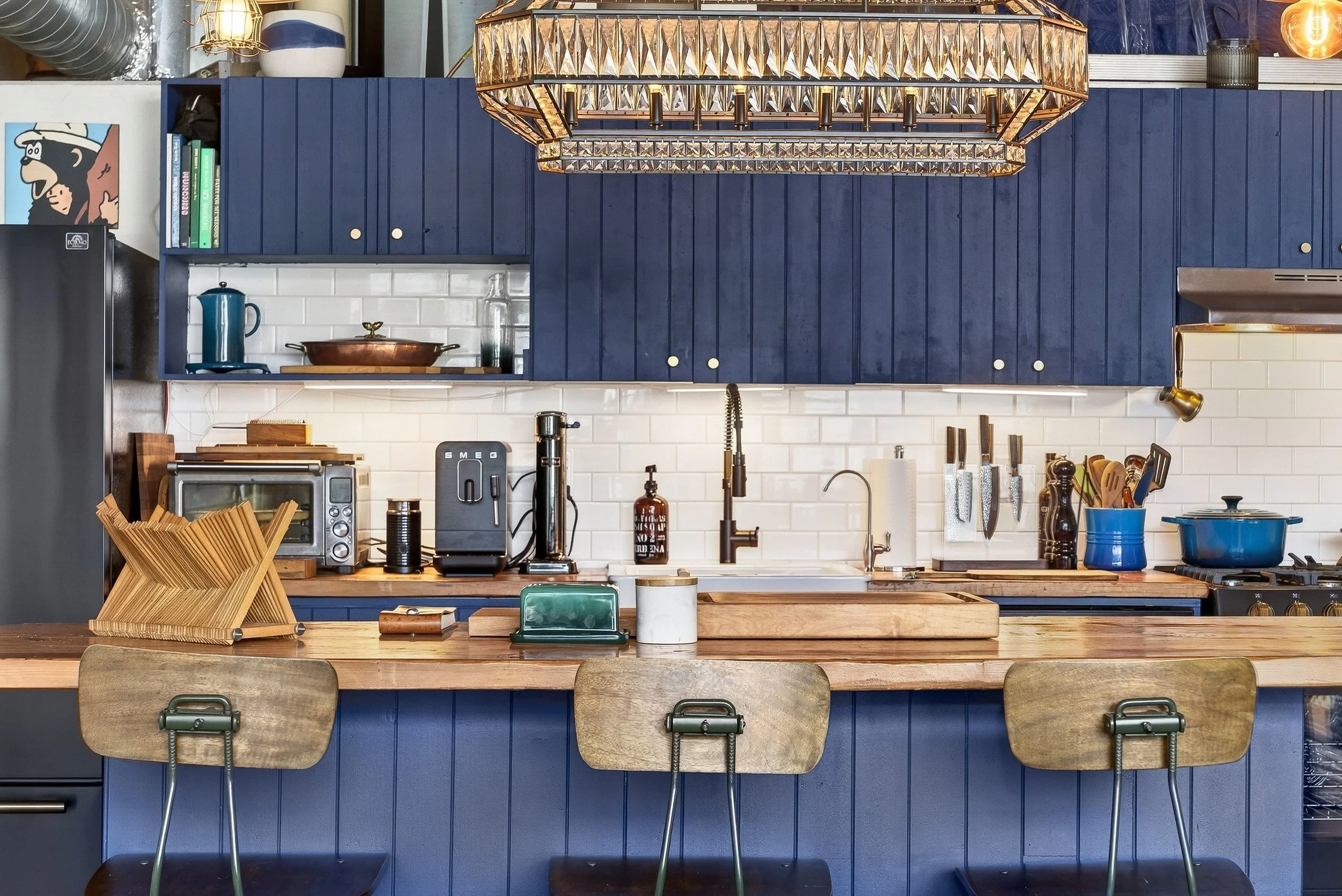 The kitchen sits right in the middle of it all. Deep blue, grounded, a little unexpected. Butcher block counters worn in just enough. A proper gas range, because details matter. Everything feels considered, but nothing feels overdone.